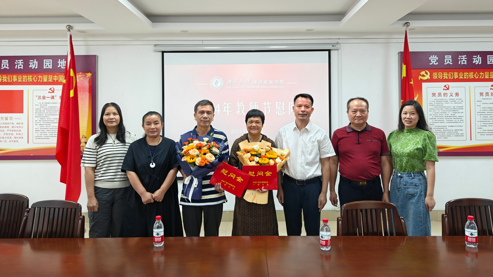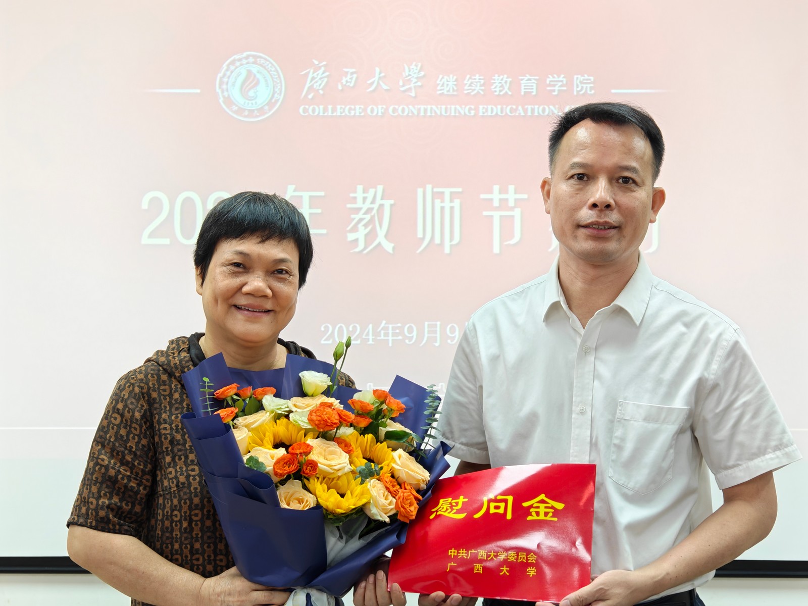 继续教育学院慰问教师代表 2024年9月10日是我国第40个教师节。9月9日,继续教育学院领导班子代表学校慰问学院在职教师代表,向他们送上鲜花并致以节日祝贺,代表学校倾听教师意见建议,传达学校关怀温暖。(陈昊宇/图) 慰问座谈代表合影 慰问黄秀萍老师 慰问马振辉老师 一审一校:陈昊宇 二审二校:陈义群 三审三校:谭鸿禹