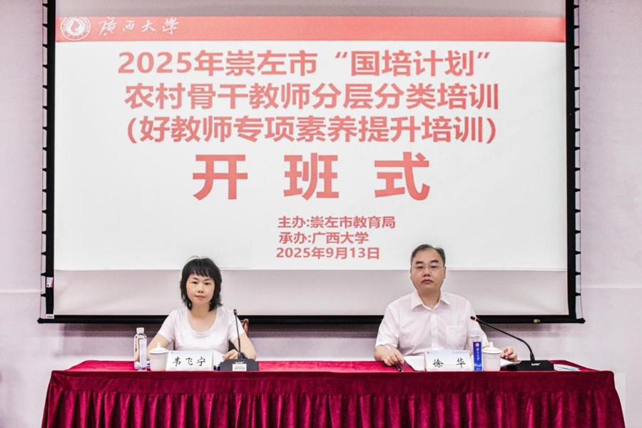 为深入贯彻落实国家关于新时代教师队伍建设改革的决策部署,提升崇左市教育系统教师的专业能力与综合素养,9月13日,由崇左市教育局统筹、广西大学承办的2025年崇左市“国培计划”农村骨干教师分层分类培训班(好教师专项素养提升培训班)在我校开班。米兰体育副院长徐华出席开班式并讲话,米兰体育副教授范小俊主持开班式。